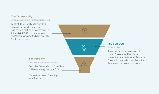 Search Funds -- by decentralising deal sourcing -- solve the fundamental challenge that while there are many, many SMEs that have a history of generating profits and cashflow, most do not make good investments and an investor needs to review hundreds of companies to find a single good acquisition target.